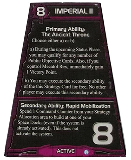 Deuxièmement, la carte Impérial II permet à un joueur de remplir plus d’un objectif dans un même tour (normalement interdit) et par conséquent de marquer plusieurs points de victoire rapidement. De plus, si le joueur actif contrôle la capitale, Mecatol Rex, il marque un point supplémentaire. Cette carte stratégique représente le prestige associé à la capitale de l’empire et à celui qui la domine. Mecatol Rex est une planète entièrement recouverte de métal. L’unique ville occupe toute la superficie. Presque tous les habitants y travaillent comme fonctionnaires. J’ai d’abord cru que cette idée venait de Star Wars. La capitale de la vieille République (épisodes I, II et III) puis de l’Empire (épisodes IV, V et VI) se nomme Coruscant. Il s’agit d’une planète entièrement recouverte de métal. L’unique ville occupe toute la superficie. Presque tous les habitants y travaillent comme fonctionnaires. Dans Fondation, la capitale de l’empire se nomme Trantor. Cette planète, entièrement recouverte de métal, n’a qu’une seule ville, où tous les habitants travaillent comme fonctionnaires… Jusqu’à la toute fin de la trilogie, elle exerce un rôle important. À l’instar de Trantor, Mecatol Rex dépend entièrement des importations pour sa survie. La planète entière ne produit ni denrée ni ressource d’aucune sorte pour celui qui la contrôle. Par contre, son influence politique lors des votes se révèle déterminante.