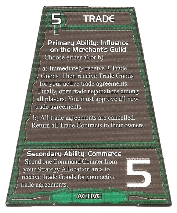 Lorsque la religion et les superstitions n’arrivent plus à assurer la sécurité et la suprématie de Fondation, qui a beaucoup gagné en puissance, les administrateurs de Terminus se tournent vers une arme aussi puissante que surprenante : le commerce. Les marchants de Fondation sont devenus avec les années très riches et puissants; ils récoltent effectivement les profits engendrés par la vente de marchandises atomiques aux systèmes voisins. Ces derniers, dépendent alors de ces objets technologiques, un peu comme nous ne saurions nous passer de l’électricité, des ordinateurs…. Aucun ne peut se permettre d’entrer en guerre contre la Fondation, ceci signifierait l’embargo et une pénurie de biens essentiels. Les accords commerciaux deviennent par conséquent des accords de paix plus ou moins forcés, très coûteux à briser. Dans TI3, la carte « Commerce » permet aux joueurs d’échanger des « Accords commerciaux ». En d’autres mots, un joueur remet une carte à un joueur en échange d’une autre. Chaque tour où la carte stratégique commerce est jouée, ces joueurs reçoivent des ressources (disons de la monnaie) d’un montant correspondant aux cartes commerciales reçues. Par exemple, le joueur A donne une carte de valeur 3 au joueur B en échange d’une de valeur 3 et une carte de valeur 1 au joueur C en échange d’une autre de valeur 3. Lors de la « récolte », A reçoit donc 6 ressources (3+3), B en reçoit 3 et C seulement 1. La règle dit que tout accord commercial conclu est annulé si l’un des deux joueurs impliqués attaque l’autre. Difficile de commercer avec quelqu’un que l’on cherche à détruire. Dans l’exemple précédent, A ne s’attaquera probablement pas à B ou C, car il retire beaucoup de ses accords. En contrepartie, comme il a peu à perdre, C pourrait facilement entrer en guerre avec B (ils n’ont aucun accord) ou même A (ce dernier profite beaucoup plus de leur échange). La Fondation se trouve un peu dans la situation de C, ses voisins profitent énormément des échanges commerciaux; ils ne la défieront pas.